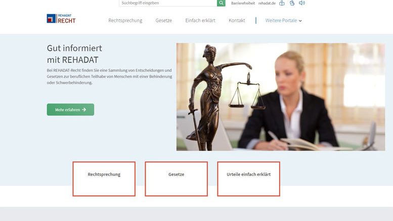 Das Portal www.rehadat-recht.de enthält eine Sammlung von über 15.500 Urteilen zur beruflichen Teilhabe von Menschen mit einer Behinderung oder Schwerbehinderung. Die Rechtsprechung stammt aus dem Arbeits-, Verwaltungs- und Sozialrecht, ergänzt durch richtungsweisende Entscheidungen des Europäischen Gerichtshofs. Außerdem sind im Portal die zugrundeliegenden Gesetze und Verordnungen dokumentiert und mit den Urteilen verlinkt, z. B. das SGB IX, die UN-Behindertenrechtskonvention und die Kraftfahrzeug-Hilfeverordnung.