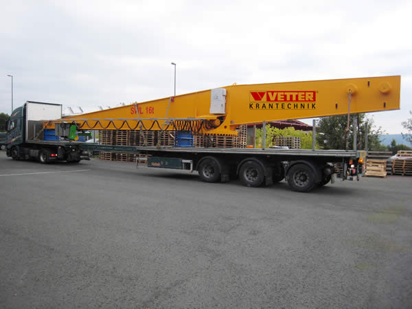 Der Transport erfolgte durch die Spedition STL aus Haiger, die hierfür zwei ausziehbare Spezial-Sattelzüge einsetzte. Verladen wurde ein riesiger Ausleger mit einer Gesamtlänge von über 20 m Meter und einem Eigengewicht von 12 Tonnen. Wegen der Überlänge handelte es sich um einen genehmigungspflichtigen Transport, der an feste Fahrtzeiten gebunden war. Die riesigen Gegengewichte aus Beton wurden von dem Wilnsdorfer Unternehmen Runkel in Form eines Vetter-V gegossen. Zusammen mit der 6 Meter langen Säule mit einem Durchmesser von 2 Metern wurden diese auf einem zweiten Sattelzug transportiert. Verladehafen nach Übersee ist Antwerpen.