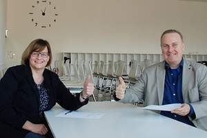 Mitte Februar wurde der Kooperationsvertrag von Petra Giesler (Personalleiterin bei Bäumer) und Michael Albrecht (Schulleiter) unterschrieben.