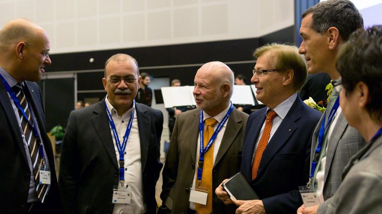 Die Organisatoren und Ehrengäste im Gespräch (v.l.): Prorektor Prof. Dr. Volker Stein, Prof. Dr. Peter Krebs und Prof. Dr. Torsten Schöne von der Universität Siegen sowie Landesjustizminister Peter Biesenbach, Siegens stellvertretender Bürgermeister Jens Kamieth und die stellvertretende Landrätin Jutta Capito.