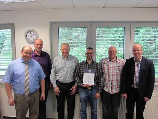 Im Bild, v.r.n.l.: Technischer Geschäftsführer M. Ebbinghaus, Disponent J. Schleifenbaum, Arbeitsschutzmanagementbeauftragter A. Uebach, Einkaufsleiter H. Groß, Betriebsratsmitglied und Sicherheitsbeauftragter K. Loos – alle Gebr. Rath Werkzeugbau GmbH, Sicherheitsfachkraft M. Siebel – Vereinigung zur Überwachung technischer Anlagen e.V.