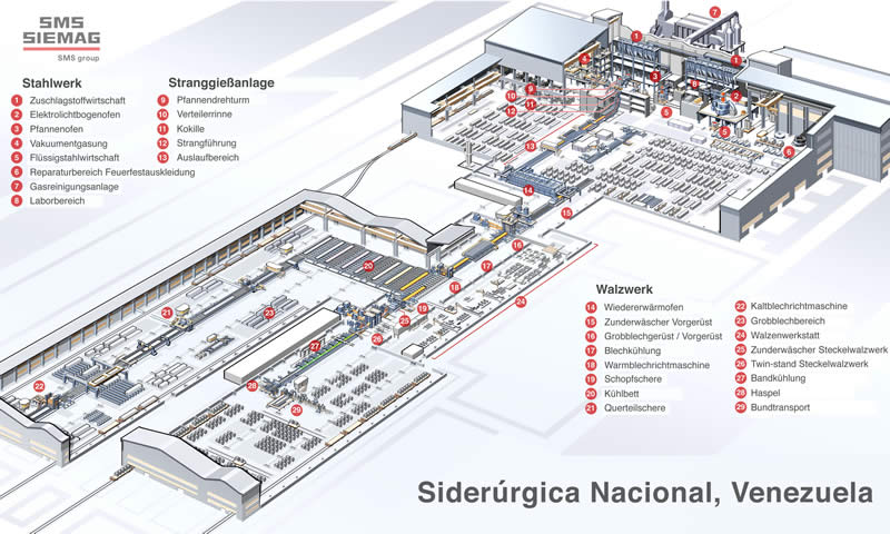 Die SMS Siemag AG in Hilchenbach-Dahlbruch (www.sms-siemag.com) hat einen Großauftrag zur Lieferung eines neuen Werkskomplexes zur Stahlherstellung und -verarbeitung für Siderúrgica Nacional (SN) in Venezuela erhalten. Der Auftrag umfasst in der ersten Phase ein Elektrostahlwerk, eine Stranggießanlage und ein Grobblechwalzwerk. In der mit kurzem zeitlichem Abstand folgenden Ausbaustufe wird das Werk mit einer Pfannenentgasungsanlage und einem Steckelwalzwerk für die Erzeugung von Warmband komplettiert. Im Lieferumfang von SMS Siemag sind die gesamte technologische Ausrüstung, die Inbetriebnahme sowie umfangreiche Schulungen für das Kundenpersonal enthalten. Die Gesamtkapazität des neuen Werkskomplexes wird jährlich 1,55 Millionen Tonnen Flüssigstahl betragen, die über die Prozesskette hinweg zu Grobblech und Warmband verarbeitet werden. Das Werk wird in Ciudad Piar im Bundesstaat Bolívar errichtet und soll die industrielle Entwicklung der Region fördern.