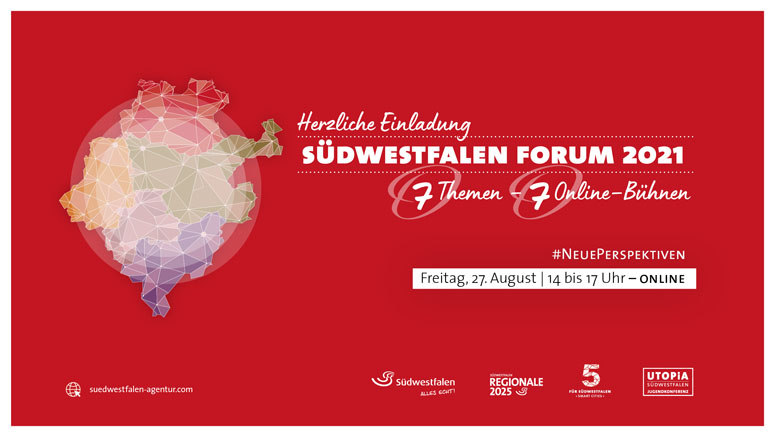 Wer beim Südwestfalen Forum am 27. August 2021 via Zoom dabei sein möchte, findet alle Informationen zur kostenlosen Anmeldung und zum Programm unter www.suedwestfalen-agentur.com/forum2021.