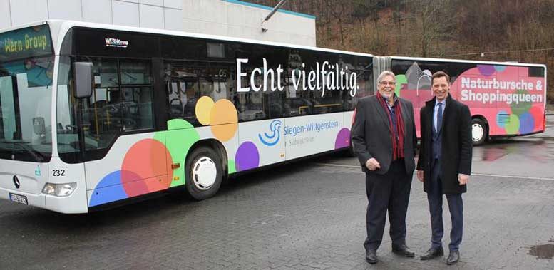 Eine Einkaufstasche mit einem Wander- und einem Stöckelschuh auf rosa Hintergrund, dazu der Slogan „Naturbursche und Shoppingqueen“ sowie das Logo „Echt vielfältig – Siegen-Wittgenstein“ – so prangt es groß auf einem Gelenkbus der VWS, der ab sofort in Siegen-Wittgenstein unterwegs ist. Landrat Andreas Müller hat den Bus jetzt gemeinsam mit VWS-Chef Klaus-Dieter Wern auf die Fahrt geschickt.