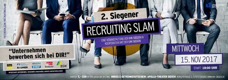 Der 2. Siegener Recruiting Slam findet am 15. November um 18 Uhr im Apollo-Theater Siegen statt. Eintrittskarten sind für 5 Euro (inkl. ein Freigetränk und Imbiss) an der Theaterkasse im Apollo Theater Siegen oder online unter www.apollosiegen.de erhältlich.