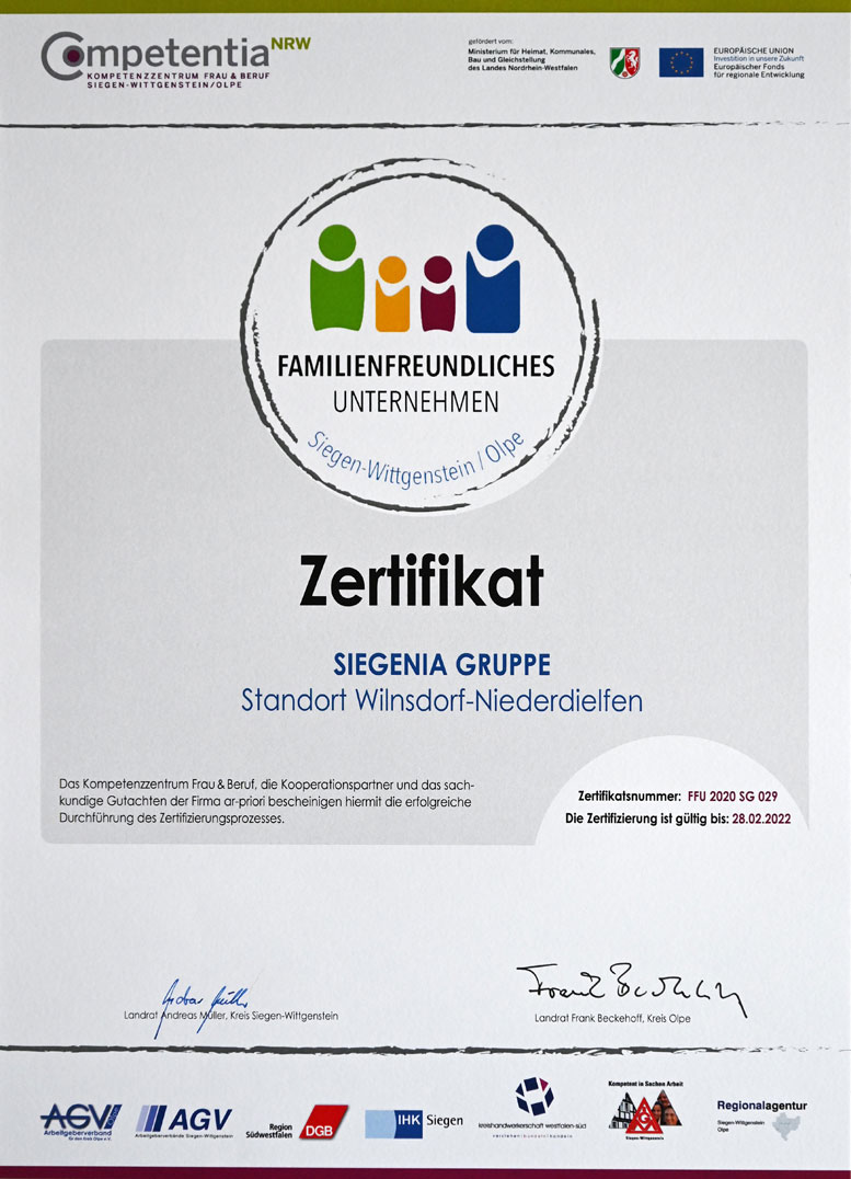 Die Vereinbarkeit von Familie und Beruf wird bei SIEGENIA großgeschrieben. Für seine Familienfreundlichkeit wurde das Unternehmen jetzt vom Kompetenzzentrum Frau & Beruf Siegen-Wittgenstein/Olpe ausgezeichnet.