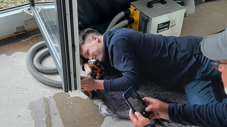 Neben Mitarbeitenden aus dem Bereich Service konnte das Unternehmen hierfür diverse erfahrene SIEGENIA-Profis und viele Azubis gewinnen. „Der ungewöhnliche Einsatz außerhalb von Betrieb und Schule und die Zusammenarbeit mit erfahrenen Kräften war für sie eine bereichernde Lernerfahrung“, schildert Roland Schöler. Von September bis Dezember waren die Serviceteams in den Hochwasserregionen im Einsatz. Dort stellten sie u. a. die Funktionalität der Elemente wieder her, indem sie im Bedarfsfall die Rahmen entwässerten und die Beschläge reinigten, fetteten und einstellten. Defekte Beschläge wurden kostenfrei ausgetauscht – auch das war Teil des SIEGENIA-Hilfspakets.