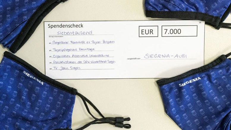 In einer über mehrere Monate währenden Verkaufsaktion stellten die Mitarbeitenden von SIEGENIA ihr traditionelles Engagement für Hilfsbedürftige erneut unter Beweis: Sie erwarben die vom Unternehmen angebotenen Alltagsmasken im SIEGENIA Design, um gemeinsam Gutes zu bewirken. Fast 3.300 Euro kamen auf diesem Weg zusammen, die von der Unternehmensleitung großzügig auf 7000 Euro aufgestockt wurden. Dieser Betrag geht nun zu jeweils gleichen Teilen an fünf regionale Einrichtungen, die aus den Vorschlägen der Mitarbeitenden ausgewählt wurden.