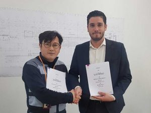 Vertragsunterzeichnung durch Byoung-Do Kim, Deputy General Manager Daehan Steel (links), und David Maurizio, Area Sales Manager SMS group.