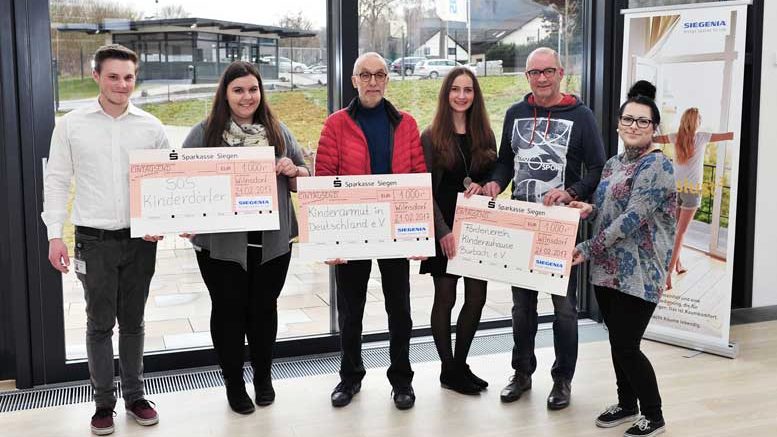 Grund zur Freude hatte in diesem Jahr der Nachwuchs. Unter den Vorschlägen der Mitarbeiter wurden für 2017 drei Organisationen ausgewählt, die durch ihre Arbeit Kindern mit einer starken gesundheitlichen Beeinträchtigung und sozial benachteiligten Kindern zu mehr Lebensqualität verhelfen: der Förderverein Kinderzuhause Burbach e.V., die SOS-Kinderdörfer und die in Wissen ansässige Organisation Kinderarmut in Deutschland e. V., die derzeit die Verlegung ihres Hauptstandorts nach Niederdielfen vorbereitet. Von den Azubis der SIEGENIA GRUPPE erhielten sie nun einen Scheck in Höhe von je 1.000 Euro.