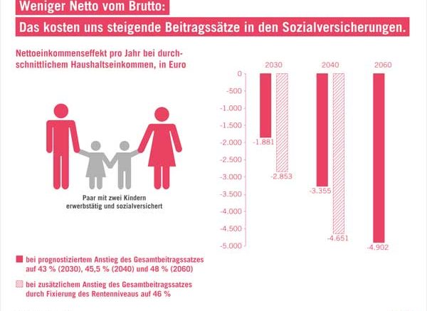 Der für das Jahr 2040 unterstellte Anstieg auf 45,5 Prozent würde sogar Nettoeinkommenseinbußen von 1.328 (Alleinerziehend, zwei Kinder) bis 3.509 Euro (Doppelverdiener, keine Kinder) pro Jahr nach sich ziehen. Sollte die Politik – wie mehrfach diskutiert – das Rentenniveau bei 46 Prozent fixieren, stiegen die Nettoeinkommensverluste auf bis zu 2.981 Euro im Jahr 2030, beziehungsweise 4.836 Euro in 2040.
