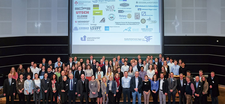Die offizielle Übergabe der Stipendien-Urkunden fand im Audimax der Universität Siegen statt. Prorektorin Prof. Dr. Alexandra Nonnenmacher überreichte die Urkunden und dankte den Förderern: „Dieses Förderprogramm ist etwas ganz Besonderes. Es profitieren alle Seiten: Die StipendiatInnen durch Mentoring und finanzielle Unterstützung, die StipendiengeberInnen durch wertvolle Kontakte. Den fördernden Unternehmen bietet das Stipendienprogramm Gelegenheit, sich nachhaltig für die Qualifizierung des Nachwuchses zu engagieren und Talente schon früh zu fördern und kennenzulernen: eine ‚Win-Win-Situation‘ für beide Seiten. In Absprache mit den Hochschulen können sie sich zudem an der Gestaltung des Programms beteiligen und beispielsweise Stipendien für besonders nachgefragte Studiengänge ausloben.