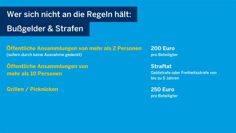 Zur Umsetzung des Kontaktverbots hat die Landesregierung einen Straf- und Bußgeldkatalog veröffentlicht. Grundlage ist das Infektionsschutzgesetz. Damit sollen Infektionen vermieden und die Ausbreitung des Coronavirus verlangsamt werden.