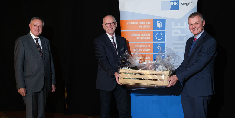 Nach seinem Abitur hatte Hermann-Josef Droege ein duales Studium als Diplomverwaltungswirt absolviert, bevor er mehrere Jahre beim Kreis Olpe arbeitete. Anschließend wechselte er zur Stadt Östringen (Baden-Württemberg). 1989 führte ihn sein beruflicher Weg nach Wilnsdorf, wo er als 1. Beigeordneter wirkte. Sieben Jahre später wurde er zum hauptamtlichen Bürgermeister der Gemeinde Burbach gewählt – ein Amt, in dem er 1999 durch Wiederwahl bestätigt wurde. 2003 wechselte er zur IHK Siegen, die ihn ein Jahr später zum stellvertretenden Hauptgeschäftsführer berief. Hermann-Josef Droege nutzte die Gelegenheit, seinerseits den Mitgliedern von Präsidium und Vollversammlung zu danken: „Über einen sehr langen Zeitraum durfte ich einen extrem spannenden beruflichen Abschnitt mit sehr großen Handlungsspielräumen erleben. Das ist nicht selbstverständlich und für mich wie für alle hauptamtlichen Mitarbeiterinnen und Mitarbeiter der IHK ein außerordentlich großer Vertrauensbeweis!“