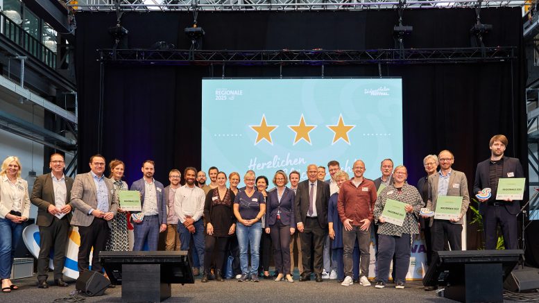 Schon im ersten Teil der Veranstaltung wurde es voll auf der Bühne. Die Scheinwerfer waren auf die 3-Sterne-Projekte der REGIONALE 2025 gerichtet. Diese haben bereits Fördermittel erhalten und werden umgesetzt. Davon gibt es bereits 15 – vom Bildungsprojekt für Schülerinnen und Schüler über digitale Unterstützung für Vereine hin zum großen Stadtentwicklungs-Vorhaben. In jeweils 90 Sekunden stellten die Verantwortlichen ihre Projekte den Gästen im Campus Buschhütten unter den Augen von Ina Scharrenbach, Ministerin für Heimat, Kommunales, Bau und Digitalisierung des Landes Nordrhein-Westfalen, vor.