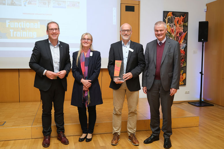 Hubertus Winterberg (links) von der Südwestfalen Agentur und IHK-Hauptgeschäftsführer Klaus Gräbener (rechts) überreichten den Sonderpreis an Silvia Ossig und Karl-Hermann Menn vom TVE Netphen.