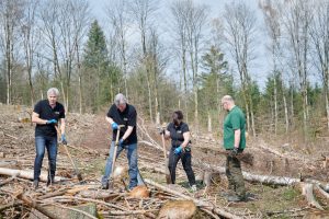 Thomas Mehrer (Geschäftsführer SVB), Peter Weil (Leiter Vertrieb SVB), Susanne Puschmann (Vertrieb, SVB) und Markus Schmidt (Forstwortschaftsmeister Stadt Siegen) forsten auf.