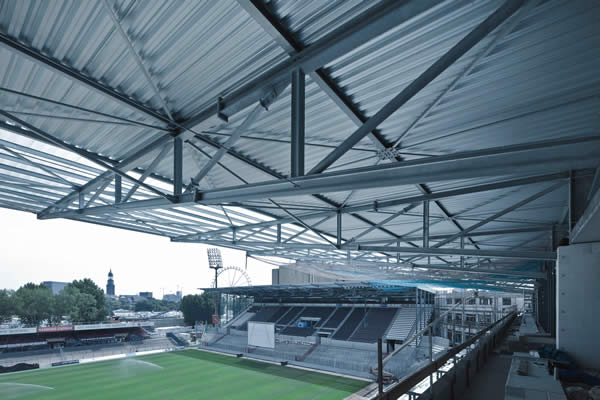 In Zusammenarbeit mit der Peters Stahlbau GmbH (PSI), Itterbeck, hat die Siegener Verzinkererei Holding (SVH) bereits im Jahr 2010 die Fachwerkkonstruktion für das Tribünendach des Millerntor-Stadions des FC St. Pauli in Hamburg langfristig vor Korrosion geschützt. Für die SVH umfasste das Projekt vor zwei Jahren ein Verzinkungsvolumen von ca. 200 Tonnen Stahl. Auf Grund der Planungen des FC St. Pauli soll im kommenden Jahr nun die Neuerrichtung der sogenannten „Gegengerade“ folgen.