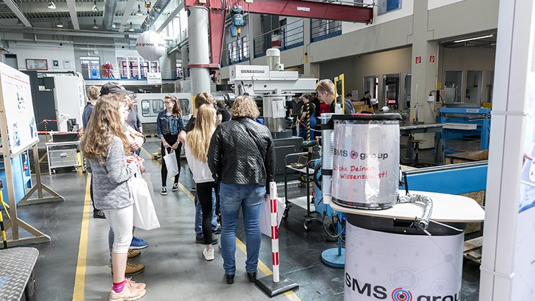 Auszubildende und Ausbilder präsentierten den zahlreichen Besuchern ihre Berufsbilder und informierten über Anforderungen, Inhalte, Abschlüsse und Zukunftsperspektiven. Bei den Gästen stießen vor allem die eingesetzte moderne Technik sowie die praxisbezogenen Einrichtungen auf großes Interesse. Im „LernWERK“ führten die Auszubildenden CNC-Maschinen, speicherprogrammierbare Steuerungen (SPS) und moderne Schweißeinrichtungen vor. Ein Renner war der Blick durch die HoloLens-Brille. Mit dieser Brille kann man interaktive 3D-Projektionen in der direkten Umgebung darstellen. SMS zeigte auch moderne Lernmedien, wie Tec2Skill, mit denen z. B. Montageanleitungen von der bildlichen Darstellung auf Papier mithilfe eines Tablets räumlich dargestellt werden. Außerdem konnten sich die Besucher Schlüsselanhänger mit ihrem Namen beschriften und einen Flaschenöffner mit dem Firmenlogo gravieren lassen. Ein Evergreen ist das Spiel am elektrischen Draht, das auch dieses Jahr bei den Besuchern wieder gut ankam. In einer multimedialen 360-Grad-Präsentation konnten sich die Besucher virtuell durch Informationen zu den verschiedenen Ausbildungsberufen des Unternehmens clicken.