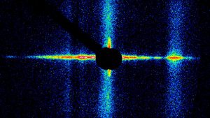 Röntgenkleinwinkelstreuung unter streifendem Einfall an einer mehrschichtigen Probe, gemessen mit einzelnen Röntgenpulsen des SACLA-Röntgenlasers in Japan. Der zentrale schwarze Kreis ist eine Strahlblende, die verwendet wurde, um den direkt gespiegelten Strahl abzudecken, der deutlich intensiver ist als das Streumuster. Das Muster enthält Information zum tiefenaufgelösten Dichteprofil (horizontale Achse) und zur Oberflächenstruktur (vertikale Achse).