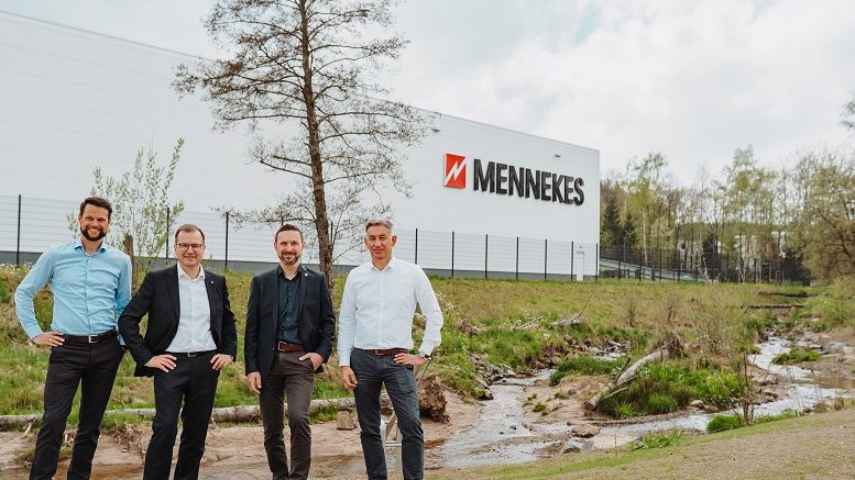 Freuen sich über den erfolgreichen Abschluss des gemeinsamen Renaturierungsprojekts: v. l. Dipl.-Ing. Hendrik Stötzel (Stoppacher Ingenieurgesellschaft, Baustellenleitung), Christopher Mennekes (geschäftsführender Gesellschafter von MENNEKES), Björn Jarosz (Bürgermeister der Gemeinde Kirchhundem) und Volker Lazzaro (Geschäftsführer von MENNEKES). (Foto: Annika Jentsch, Medienwerk)