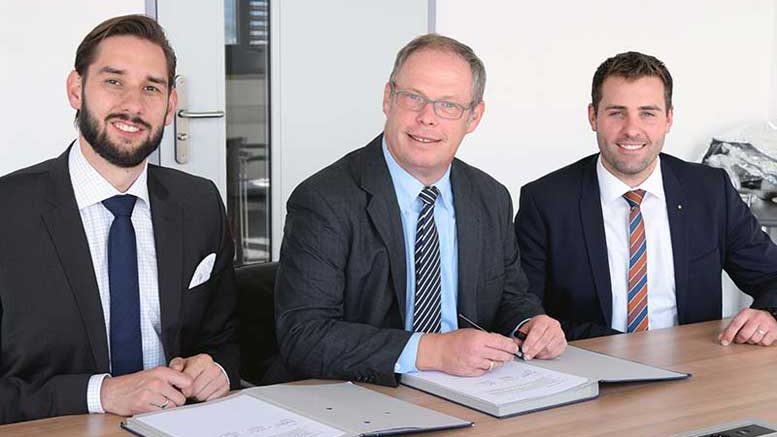 Die statmath-Geschäftsführer Christian Friedrich (l.) und Dr. Alexander Hoffmann (r.) mit Uni-Kanzler Ulf Richter bei der Vertragsunterzeichnung.