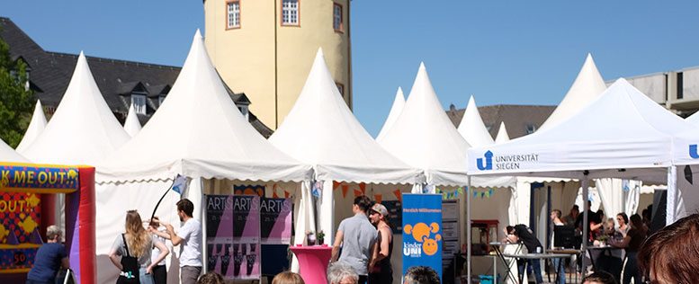 Viele BürgerInnen nutzen die Offene Uni auch, um im wahrsten Sinne des Wortes hinter die Kulissen zu blicken. In Führungen erfuhren sie, wie aus der ehemaligen Fürsten-Residenz das Gefängnis und aus dem Gefängnis die Uni-Bibliothek wurde. Auf der Bühne spielten Singer-Songwriter, Indie-Bands und die Uni Big Band. Die Akrobatik-Gruppe des Hochschulsports begeisterte mit gewagten Formationen. Alle KünstlerInnen hatten sich über Facebook beworben und sind aktuelle oder ehemalige Studierende und MitarbeiterInnen der Uni. Unter dem Motto „Wir müssen reden“ diskutierten Studierende und Uni-MitarbeiterInnen außerdem die Frage: „Siegen – Unistadt oder Stadt mit Uni?“