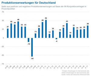 Die deutschen Firmen sind gut ausgelastet, die Beschäftigung steigt weiterhin und die Arbeitslosigkeit geht weiter zurück. Und nach Meinung der deutschen Wirtschaft bleibt das auch so: Fast die Hälfte der knapp 2.800 vom IW Köln befragten Unternehmen rechnet mit einer höheren Produktion als im Vorjahr. 40 Prozent wollen in diesem Jahr neue Mitarbeiter einstellen, nur 12 Prozent erwarten eine sinkende Beschäftigung. Der Optimismus wirkt sich auch auf die Investitionen aus: 43 Prozent der Firmen planen höhere Ausgaben, nur 14 Prozent gehen von niedrigeren Investitionen aus – das ergibt einen Saldo aus positiven und negativen Meldungen von 29 Prozent. Damit hat sich die Stimmung im Vergleich zum Herbst 2016 deutlich verbessert – damals betrug der Saldo nur 17 Prozent.