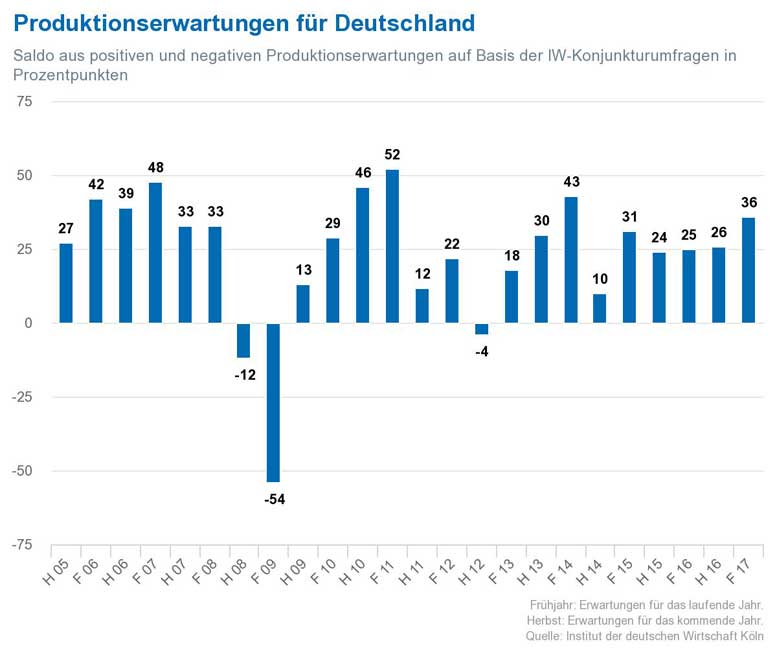 Die deutschen Firmen sind gut ausgelastet, die Beschäftigung steigt weiterhin und die Arbeitslosigkeit geht weiter zurück. Und nach Meinung der deutschen Wirtschaft bleibt das auch so: Fast die Hälfte der knapp 2.800 vom IW Köln befragten Unternehmen rechnet mit einer höheren Produktion als im Vorjahr. 40 Prozent wollen in diesem Jahr neue Mitarbeiter einstellen, nur 12 Prozent erwarten eine sinkende Beschäftigung. Der Optimismus wirkt sich auch auf die Investitionen aus: 43 Prozent der Firmen planen höhere Ausgaben, nur 14 Prozent gehen von niedrigeren Investitionen aus – das ergibt einen Saldo aus positiven und negativen Meldungen von 29 Prozent. Damit hat sich die Stimmung im Vergleich zum Herbst 2016 deutlich verbessert – damals betrug der Saldo nur 17 Prozent.