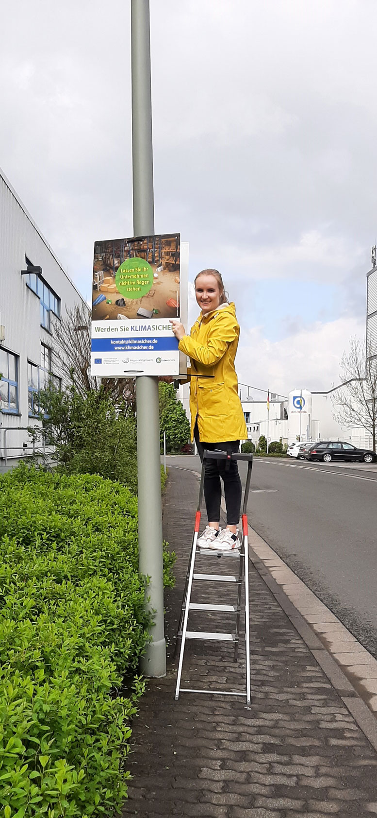 Regionalkoordinatorin Lara Meurer hat jetzt insgesamt 90 Plakate in Gewerbegebieten im Kreis Siegen-Wittgenstein angebracht, um Unternehmen für die Teilnahme am Projekt „KlimaSicher“ zu gewinnen.