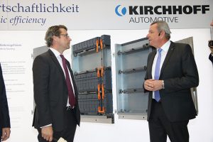 „Die gesamte Nutzfahrzeugindustrie ist im Aufbruch. Alle Hersteller gehen neue Wege, um den Transport der Zukunft zu gestalten“, sagte VDA-Präsident Bernhard Mattes. Das Highlight auf dem KIRCHHOFF Automotive Messestand bildet ein skalierbares Batteriegehäuse in Leichtbauweise (Kombination aus Stahl und Aluminium) für elektrisch angetriebene Fahrzeuge. Zu den Besonderheiten und Vorteilen dieses Batteriegehäuses zählen ein kostenoptimiertes Design, Korrosions- und Unterbodenschutz, ein integriertes Kühlsystem und ein optimiertes Crashverhalten. Das innovative und wirtschaftliche Leichtbau-Konzept sorgt für die sichere Unterbringung von Hochvolt-Batteriemodulen. Das Gehäusedesign ist skalierbar und damit in unterschiedlichen Fahrzeugmodellen und Derivaten einsetzbar.