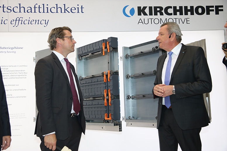 Lösungen für alternative Antriebe stehen im Vordergrund der IAA Nutzfahrzeuge in Hannover. Am Stand von KIRCHHOFF Automotive zeigte J. Wolfgang Kirchhoff, Geschäftsführender Gesellschafter der KIRCHHOFF Gruppe, Bundesverkehrsminister Andreas Scheuer innovative und wirtschaftliche Leichtbau-Konzepte für die sichere Unterbringung von Hochvolt-Batteriemodulen.