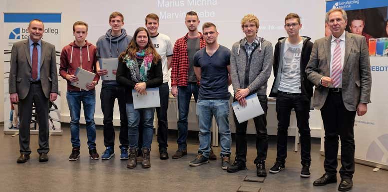 Drei Prüfungsbeste hatten ihre Ausbildung bei der SMS group GmbH durchlaufen. Simon Rill wurde als bester Anlagenmechaniker geehrt, Jan Buch als bester Mechatroniker, Tanja Hellermann erzielte als Technische Produktdesignerin die höchste Punktzahl. Auch die Heinrich Georg GmbH konnte mit Tillmann Bäumener als leistungsfähigstem Industriemechaniker und Marvin Grebe als bestem Zerspanungsmechaniker im Altkreis Siegen stolz auf deren Leistung sein. Bei den Werkzeugmechanikern erzielte Marius Michna von der Egle Werkzeugbau GmbH & Co. KG die höchste Punktzahl. Der erfolgreichste Konstruktionsmechaniker war Pascal Sauerwald von der Brühl Safety GmbH. Der beste Elektroniker für Betriebstechnik, Stefan Lauer, wurde bei der Westnetz GmbH ausgebildet.