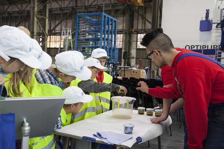 Während der anschließenden Führung in fünf Gruppen durch die Achenbach-Fertigungs- und Montagehallen an fünf Stationen durch je zwei Azubis (Felix Krämer, Mattis Michel, Jean Michel Betz, Jason Jung, Finn Oerter, Sander Rompf, Thomas Nikel, Marius Paul, Lukas Birlenbach, Jörn Oerter, Sascha Horn, Tom Zimmermann) erfuhren die Kinder dann auch praktisch, was man ihnen zuvor eher theoretisch vorgestellt hatte. Jedes Kind durfte eine CNC-Fräsmaschine in der Lehrwerkstatt selbst bedienen, das Firmenlogo in ein Stück Aluminium fräsen und auf der Rückseite mit seinen Initialen versehen. Außerdem konnten sich alle Kinder, die wollten, die Fertigung aus 5 Metern Höhe von der Hebebühne aus ansehen, am Filterteststand verschmutztes Öl reinigen, das Gewicht von Stahl und Aluminium vergleichen und den Paternoster zur Materialausgabe von Kleinteilen bedienen, und, o Wunder, lieferte dieser statt Schrauben leckere Smarties.