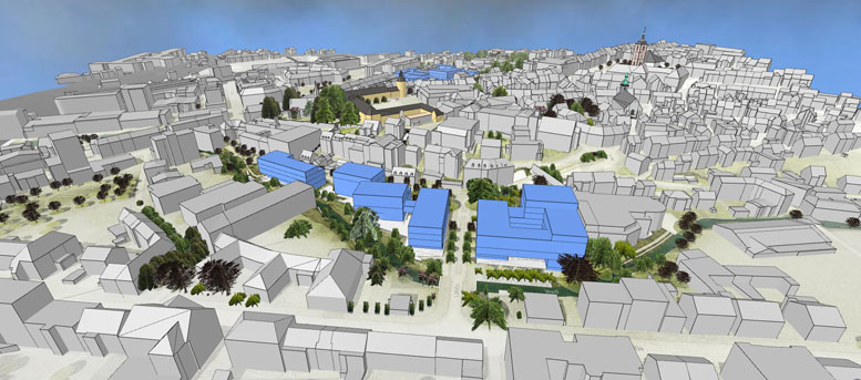 Da es auf dem Stadtplan nicht ganz einfach ist, sich die Dimensionen der neu entstehenden Gebäude an den Campus-Standorten und das zukünftige Stadtbild räumlich vorzustellen, können Interessierte jetzt einen virtuellen Rundgang durch die zukünftige Innenstadt machen. Auf der Projektwebsite (www.siegen-wissen-verbindet.de) ist ab sofort ein maßstabsgetreues 3D-Modell der Siegener Innenstadt zu finden. Neben den Gebäuden im Bestand sind hier die geplanten Universitätsgebäude zu sehen. Diese sind zur besseren Orientierung blau eingefärbt.