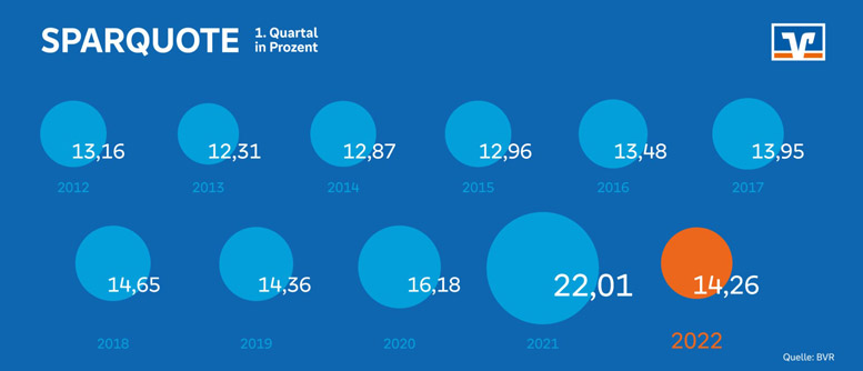 „Die bundesweiten Zahlen zum Sparverhalten zeigen, dass die aktuelle Energiekrise die deutschen Sparer vor große Herausforderungen stellt“, so Müller weiter. Einer Studie des Bundesverbandes der Deutschen Volksbanken und Raiffeisenbanken (BVR) zufolge droht die Sparquote dieses Jahr mit neun bis zehn Prozent zum ersten Mal seit fast einem Jahrzehnt einstellig auszufallen. Während der Coronapandemie hatte sich der Wert aufgrund eines unfreiwilligen Verzichts bei Konsum und Urlaub deutlich auf 15,1 Prozent (2021) erhöht.