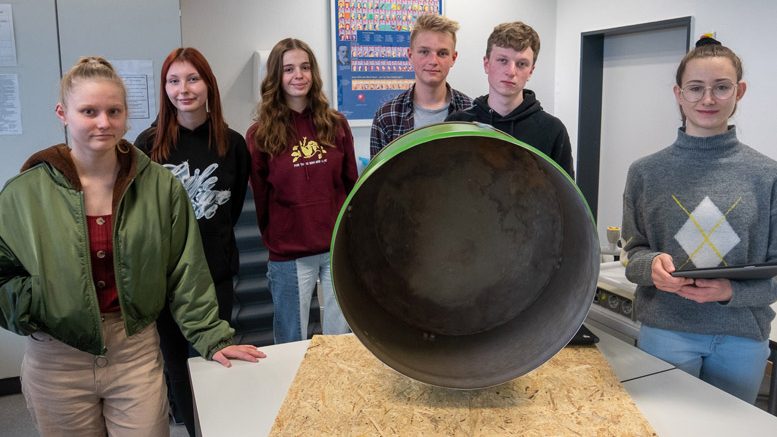 Entwickeln ein nachhaltiges und biologisch abbaubares Besteck für Festivals: Schülerinnen und Schüler der Gesamtschule Freudenberg. Koordiniert wird das Projekt von der Universität Siegen um Prof. Martin Gröger (hinten, 3. v.l.), Christian Klein (hinten, 4, v.l.) und Kristina Oliveira (r.). Die Sparkasse Siegen um Vorstandsmitglied Günter Zimmermann (2. v.r.) unterstützt das Projekt.