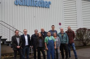 Arif Ates (vorne im Bild) mit den Beteiligten der Agentur für Arbeit, des Integrationsfachdienstes, des CJD, der Fachstelle für behinderte Menschen des Kreises Siegen-Wittgenstein und des Unternehmens Wilhelm Schumacher in Hilchenbach