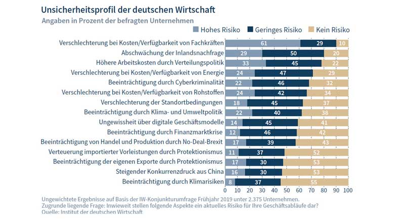 Seit Monaten tritt die deutsche Wirtschaft auf der Stelle. Vor allem die Industrie leidet seit Anfang vergangenen Jahres unter einem Abschwung. Als wichtigste Ursache dafür gelten meist weltweite Unsicherheiten und der zunehmende Protektionismus. Dabei beschäftigen die meisten deutschen Unternehmen größtenteils andere Sorgen, zeigt eine neue IW-Studie: Demnach sind Fachkräfte-Engpässe das größte Problem. Rund 61 Prozent der deutschen Unternehmen sehen darin ein großes Risiko für ihre Geschäftsabläufe. Für die Studie wurden rund 2.400 deutsche Unternehmen im Frühjahr dieses Jahres befragt.