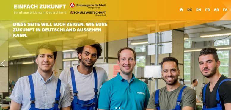 Der Online-Flyer ist eine Website für mobile Endgeräte, die auch in Englisch, Französisch, Arabisch, Tigrinya und Farsi angeboten wird. Unter dem Titel „Einfach Zukunft“ werden anhand authentischer Geschichten von jungen Geflüchteten die Ausbildungsmöglichkeiten in Deutschland dargestellt. Zunächst konnten ausschließlich junge Männer für die Präsentation gewonnen werden. Diese haben eine Einstiegsqualifizierung durchlaufen und absolvieren jetzt mit Einsatz und Freude eine duale Berufsausbildung. Die jungen Menschen stellen sich vor, beschreiben ihre Vorstellungen und Erwartungen und schildern ihren Weg zur Berufswahl und in Ausbildung. Dies wird mit konkreten Tipps für die eigene berufliche Orientierung und das weitere Vorgehen der Nutzerinnen und Nutzer anschaulich verbunden. In einem nächsten Schritt ist geplant, auch junge Frauen zu Wort kommen zu lassen.