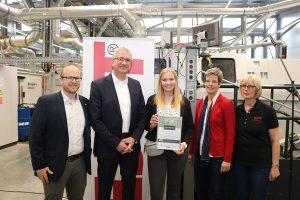 Im Bild (v.l.): Andreas Kurth (Leiter Ausbildung & Studium bei EJOT), Dr. Frank Dratschmidt (EJOT-Geschäftsführer), Jana Reinhard (beste Auszubildende des Jahres 2019), Daniela Tomczak (Vorsitzende der Geschäftsführung bei der Agentur für Arbeit in Siegen) und Andrea Afflerbach (kfm. Ausbilderin bei EJOT).